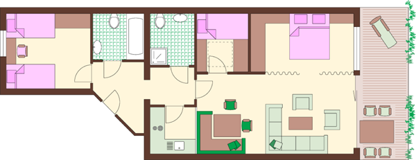 Apartament Typu C trzypokojowym mieszkaniem o powierzchni 68 m2. Mieszkanie składa się z przedpokoju, łazienki z WC, prysznica z WC, dwóch sypialni z dwuosobowym łóżkiem każda, w pełni wyposażonej kuchni ze zmywarką i ekspresem do kawy, wygodnego kącika jadalnego oraz salonu z narożnikiem (może służyć jako miejsce do spania dla dwóch dodatkowych osób) i balkonu.
